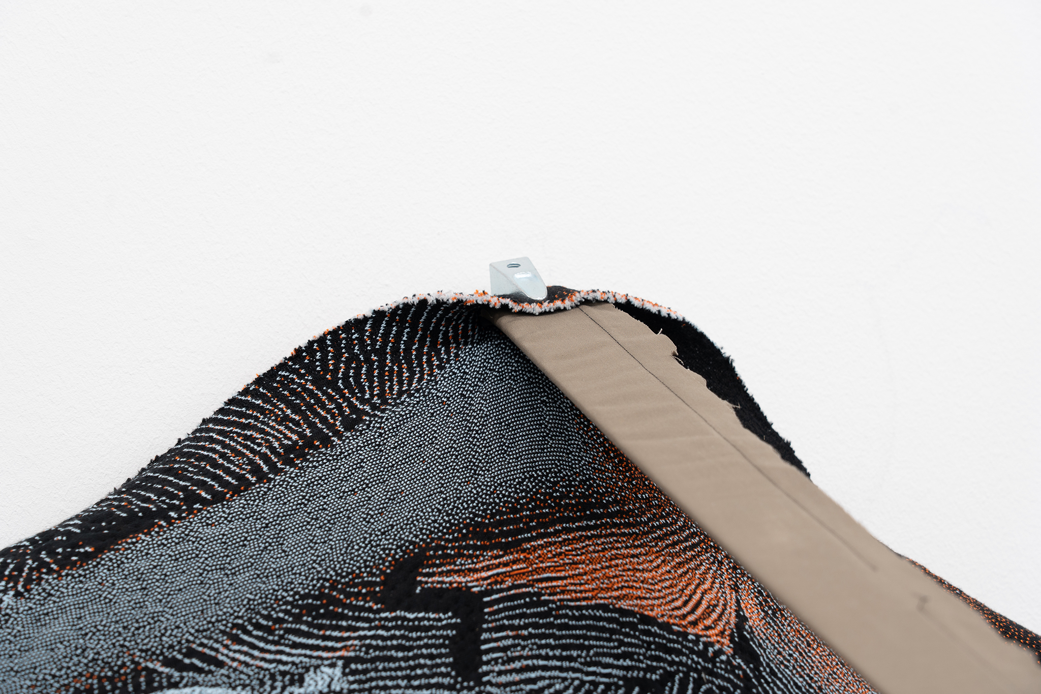 In this work, the textile is suspended low and diagonally hanging on a metal rig and cables on the largest wall of the space. Rather than shown as tapestry, the textile arches, in a structure borrowed from the existing logic of an awning – indicating the transition from a public space to one of commerce. Through its low height, the underside – accessible to viewers via makeshift wooden carts – creates an intimate space, toned down in colour, close to the face, and damping the surrounding. I like to think of it as the blanket or tablecloth that you build a world under as a child – a place of observation of the adult world. The carts propose both a position of rest and maintenance.
