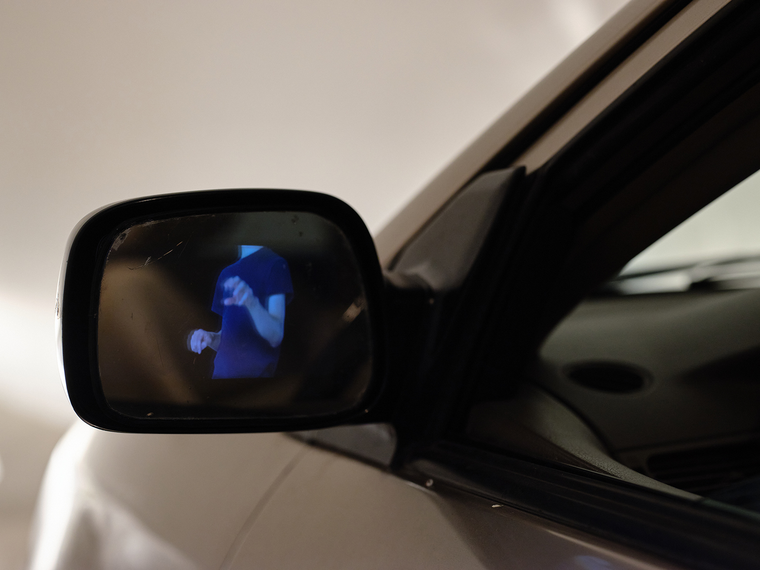 This 30 seconds edit from the original 1h 42’ 27’’ performance captured on video shows a small fragment of the production of a car that the artist realised as his job in 2014 at a BMW car factory in Munich. The original repetetive movements from the factory where remade from body memory and filmed in a single take. For the exhibition “Holy Motors” at Espacio Cabeza, Guadalajara, the video was given a new form, integrated into the side mirror of a car parked in the dimly-lid exhibition space.